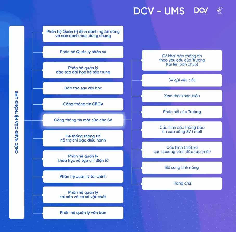 Theo DCV, UMS là nền tảng quản trị nhà trường được thiết kế cho các cơ sở giáo dục đại học, tích hợp các phân hệ chính như quản lý đào tạo, tuyển sinh, hồ sơ sinh viên, lịch học – lịch thi, đánh giá học tập, tài chính – học phí và chăm sóc người học. Hệ thống vận hành trên kiến trúc hiện đại, linh hoạt, có khả năng kết nối với các phần mềm và hạ tầng CNTT hiện có của nhà trường.